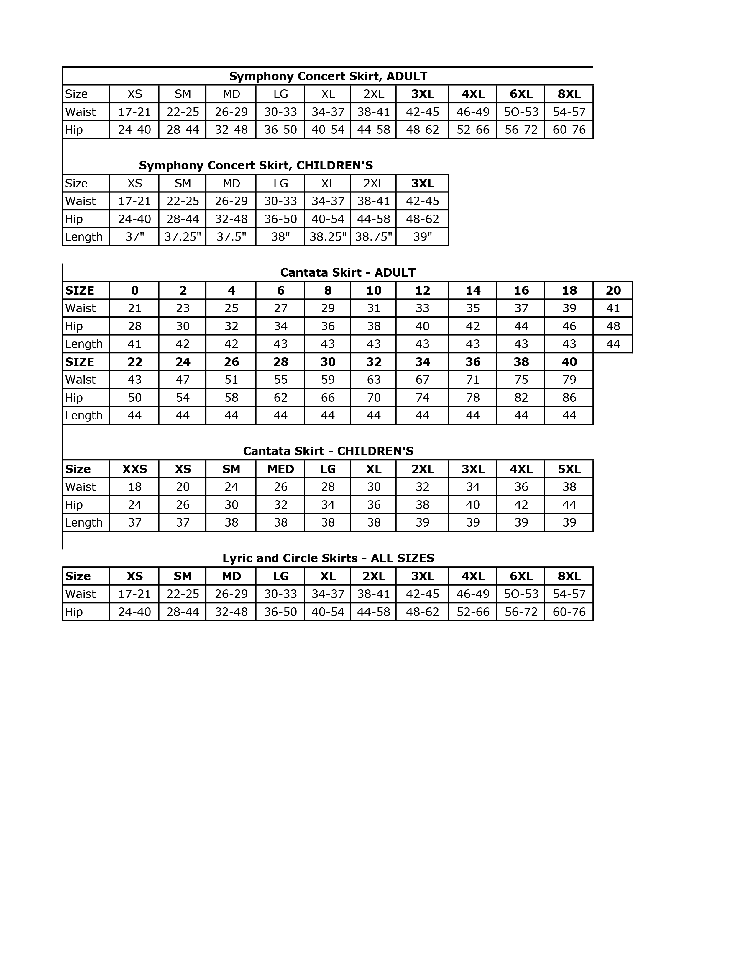 Our Symphony Concert skirt is a four panel A line skirt. It is 43 inches long, has a finished elastic waistband and is offered in adult sizes XS thru 8XL with an average flair of 100". Available in youth sizes XS thru 3XL.